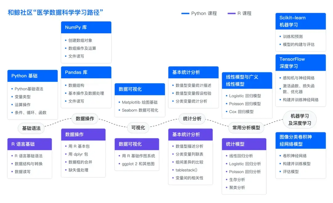 和鲸社区精心整合了一套全面的医学数据科学学习路径,旨在助力医学领域人才实现技能跃升。该学习路径全面覆盖 Python 与 R 两种主流编程语言,精心设计了一系列课程,从编程语言基础、数据可视化技巧、统计分析方法,到机器学习与深度学习技术,乃至临床预测模型的构建与应用,每一环节都紧密相连,形成了一条完整的知识链条,帮助更多数据爱好者成长。此外,和鲸也通过不断更新的训练营、Workshop 等方式向潜在科室和潜在人才进行价值传递。