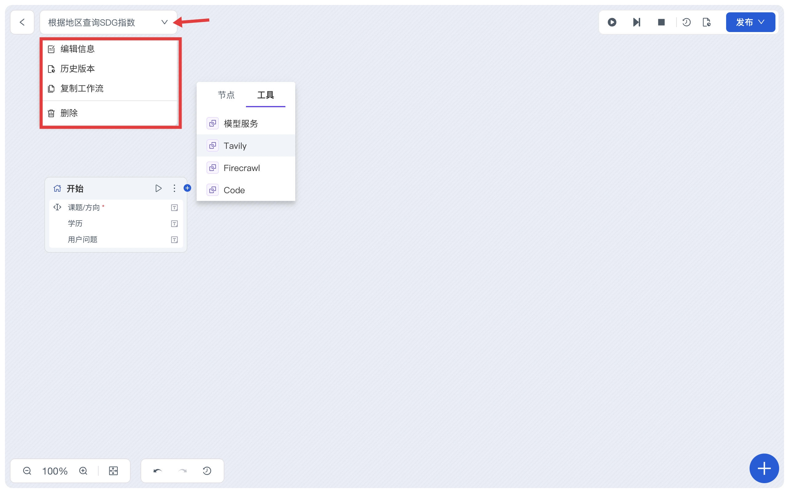 工作流编排界面,左上角返回列表UI 调整,并增加一些工作流操作选项: