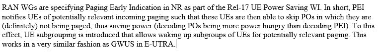 引入PEI机制的动机就是节能,按照spec规定UE会在自己的PO上监听P-RNTI加扰的DCI,进而deocde paging,这就会导致有时候即使没有paging下发,UE也要起来监听paging,进而出现false paging alarms的情况,这种现象实际log中也有体现。针对这种情况,R17引入PEI,通过对PO内的UE进行分组,然后网络侧将PEI occasion和PO关联,只有UE收到所属subgroup的PEI 显示有paging要收时,UE才会在关联PO decode paging,否则UE就可以继续休眠,进而达到节能的目的。下图是R17 EPI机制的示意图和优点。
