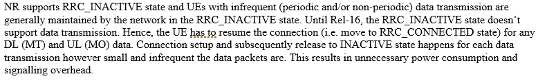 NR支持RRC_INACTIVE ,当UE不需要进行频繁的数据传输时,网络通过会让UE处于RRC_INACTIVE状态(实际上国内目前看,网络侧并未开启RRC inactive状态,只在lab测试中接触过RRC inactive)。 在R16之前,RRC_INACTIVE状态不支持数据传输。 因此,如果UE要数据传输的话,就要先进入RRC connected才行。 这样每次有类似的场景,UE就要进行从RRC Connected mode到RRC inactive之间进行转换。如果要传输的数据包很小并且传输频率很低的话,上面的过程就会导致不必要的功耗和信令开销。