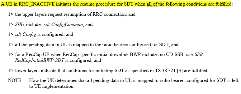 当满足以下所有条件时,RRC_INACTIVE中的UE就会发起SDT的resume过程: