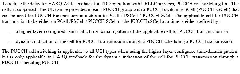 为了减少使用 URLLC 服务的 TDD 操作的 HARQ-ACK 反馈的延迟,就引入了TDD 小区的PUCCH cell switching。 除了PCell/PSCell/PUCCH SCell之外,每个PUCCH group中还可以向UE配置用于PUCCH传输的PUCCH switching SCell(PUCCH sSCell)