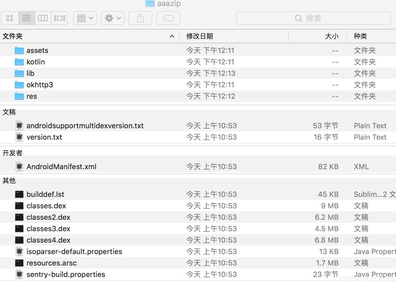 apk包是一个zip格式的压缩包,把扩展名改成zip,然后解压。解压后可以看到这个apk包中的文件,不同apk包中有所区别。