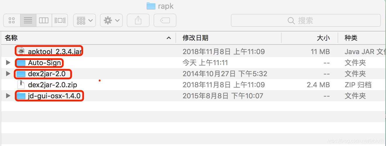如果你下载了(2)中的压缩包解压,先解压,然把里面的dex2jar-2.0.zip也解压,如下图,共4个工具: