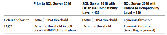 表3-1总结了不同版本SQL Server的统计更新阈值行为。