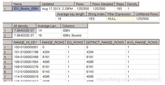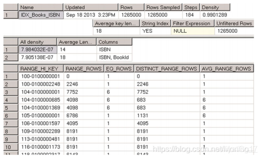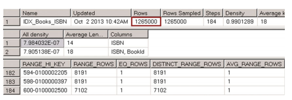 第二个结果集称为密度向量,包含关于组合密度的信息统计数据(索引)中的键值。它是根据1 /个数的不同值计算的公式,它指示键值的每个组合平均有多少行。即使IDX_Books_ISBN索引只定义了一个键列ISBN,它还包括一个聚集索引键下标行。我们的表有1,252,500个惟一的ISBN值,ISBN列的密度为1.0 /1,252,500 = 7.984032E-07。所有(ISBN, BookId)列的组合也是惟一的,并且具有相同密度。