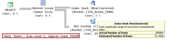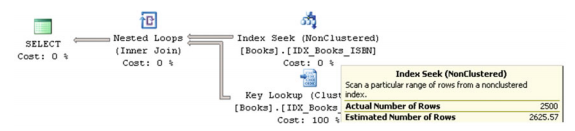 大多数执行计划操作符都具有两个重要属性。实际行数指示操作符执行期间处理了多少行。估计行数表示在查询优化阶段为该操作符估计的SQL Server行数。在我们的在这种情况下,SQL Server估计有2625行ISBN s从114开始。如果你看柱状图如图3-2所示,您将看到步骤10存储了ISBN的数据分布信息interval,它包含您正在选择的值。即使用线性近似,你也可以估计接近SQL Server确定的行数。