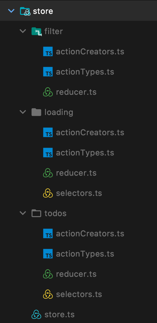 这里注意到在这个 redcuer 里其实包含了对 todos 和 filter 的操作,整个 reducer 看起来很冗长,因此我们会想将 todos 就搞 todosReducer 来管, filter 就用 filterReducer 来管,这种分开管理的子 store 被称为 “slice”。