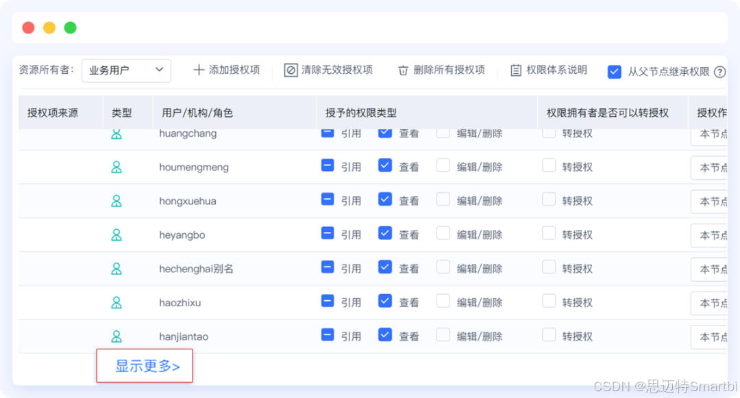 资源授权界面数据量大时,加载慢、甚至无法使用。新版本界面改为默认只展示部分数据,需更多数据时点击“显示更多”按钮,性能大幅提升,2000+条数据加载时间缩短至2秒。
