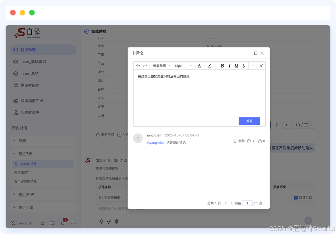 10 月版本焕新上线!Smartbi AIChat 与一站式 ABI 平台再升级,聚焦「交互体验、数据效率、部署适配、安全管控」四大方向,解决沟通闭环、国产化迁移、大规模授权加载慢等实际业务痛点,让数据分析更顺畅、部署更灵活、安全更可靠,助力企业降本提效!下文为你拆解功能亮点~