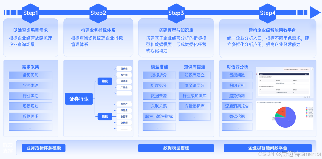 我们总结出一套可落地的四步实施方法论:明确需求→建指标→搭模型→构平台,助力快速搭智能问数平台。