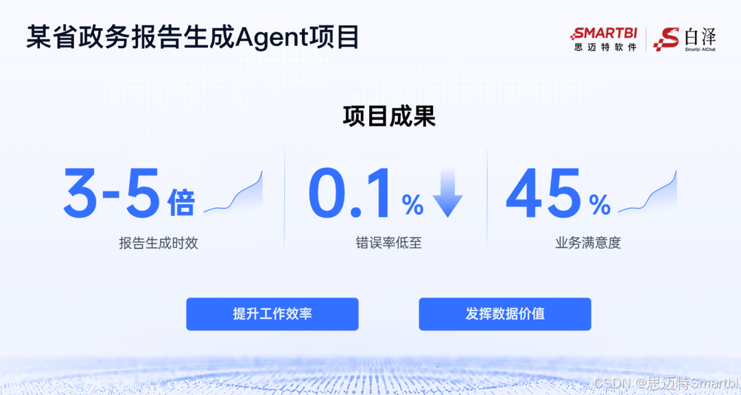 截至目前,AIChat已服务百余家企业、数万用户。比如为某省政务做的报告智能体,整合多部门数据后,人工报表周期从 2-3 天缩至分钟级,数据清洗1-2 小时就能完成,报告生成速度提升300%,错误率仅 0.1%,业务满意度提升 45%。