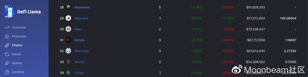 链上TVL数据客观展示了Moonriver生态拥有的去中心化协议运行状态,同时向公众展示有哪些参与Moonriver DeFi活动的机会。第三方数据分析平台DeFi Lama展示了Moonriver现有的TVL已超过9,000万美元,处于排名前三十的状态。