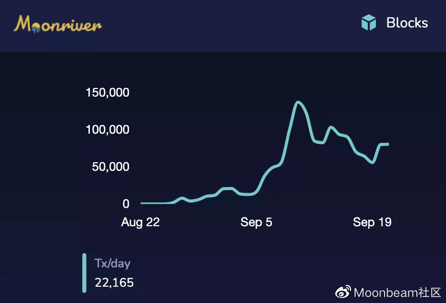 我们熟悉的网络拥堵可以从日交易量中找到端倪。当日交易量增幅明显,Gas手续费也会随之上升,交易速度同时也会略有放慢。Blockscout的Moonriver日交易量图表还可以帮助我们了解Moonriver交易量的历史峰值。在9月10日,日交易量到达137,211笔,30天内增幅超过270%,交易量规模远超同期公链发展。