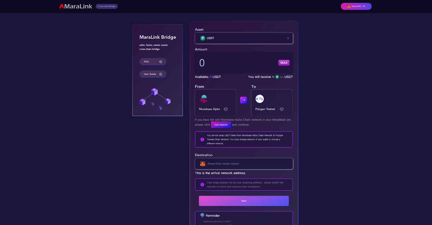 AmaraLink beta已部署在Moonbase Alpha网络(Moonbeam测试网),连通Moonbase Alpha与Polygon测试网,并支持BTC、DOT、USDT、KSM四种测试资产的跨链转账。为下一步正式在Moonriver网络部署奠定了良好基础。
