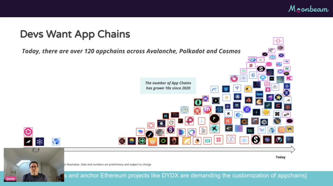 这又让我们回到了我最初提出的想法:Moonbeam拥有的优质EVM兼容开发环境,海量的开发工具和应用,选择多样的跨链协议。完成了这些后,在一个问题来了,如何帮助这些应用实现规模化的扩展呢?我们无法忽视近期的一个事实,应用链的数量正在快速增长。