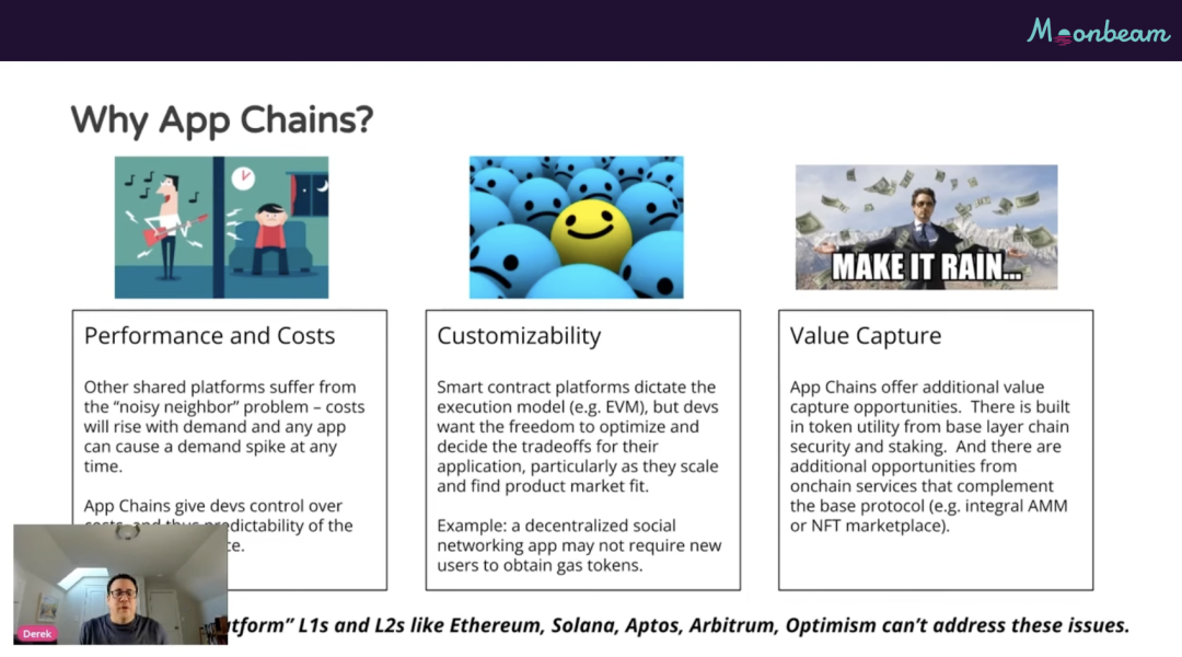 以此类推,应用链也正在区块链世界中表达这一概念:即在Web3中,您的应用将匹配其专属于它的区块链,而不是在一个共享资源的区块链平台。