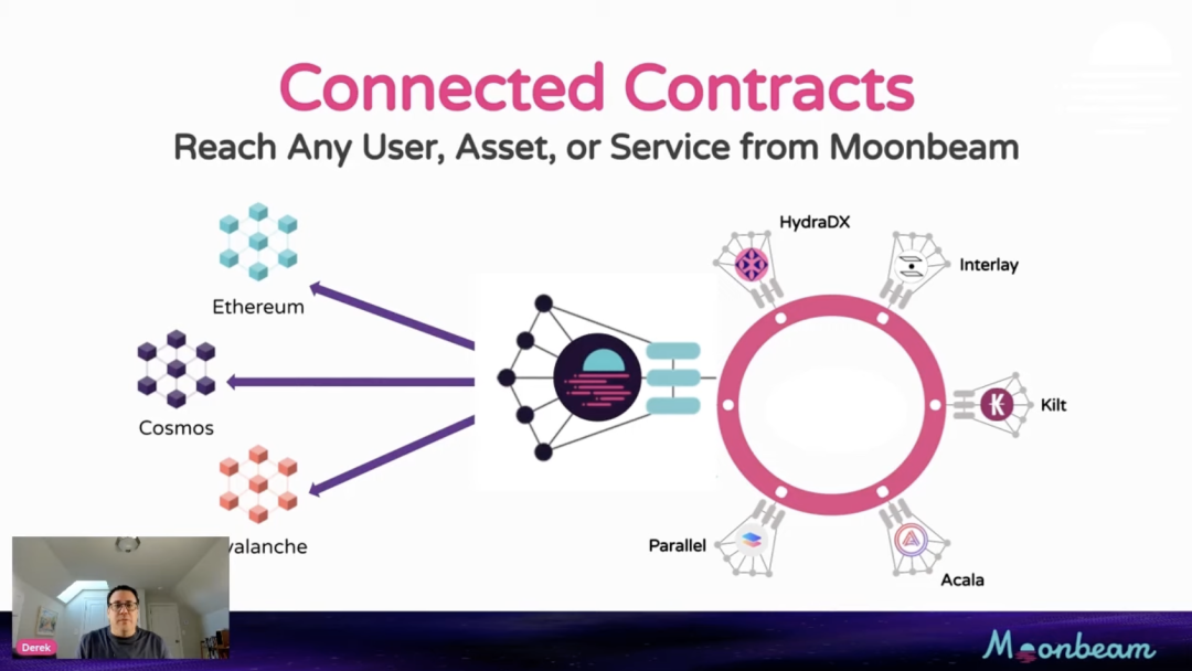 按照这种设想,Moonbeam专注于我们所描述的Connected Contracts。通过跨链互操作协议,智能合约可以在Moonbeam获取来自任何链上的用户、服务等。已经有大量的应用已经运用这种方式运行在Moonbeam,你将看到更多运用跨链互操作协议实现自身业务的知名项目演示,包括他们的业务是如何展开和使用的介绍。