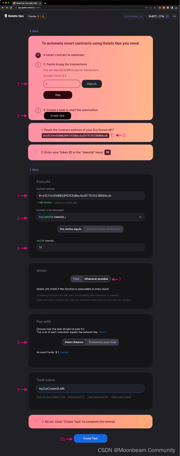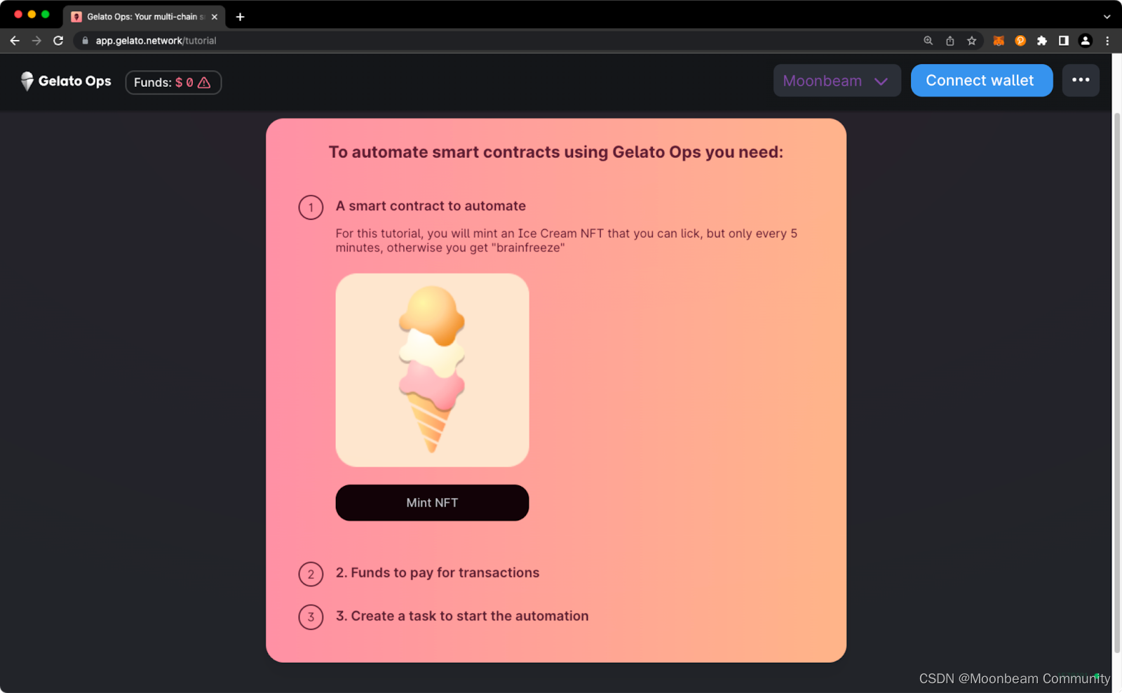 开始之前,请先前往Gelato Automate | Decentralized smart contract automation,确保您已在钱包中选择Moonbeam网络,并将其连接至Gelato。