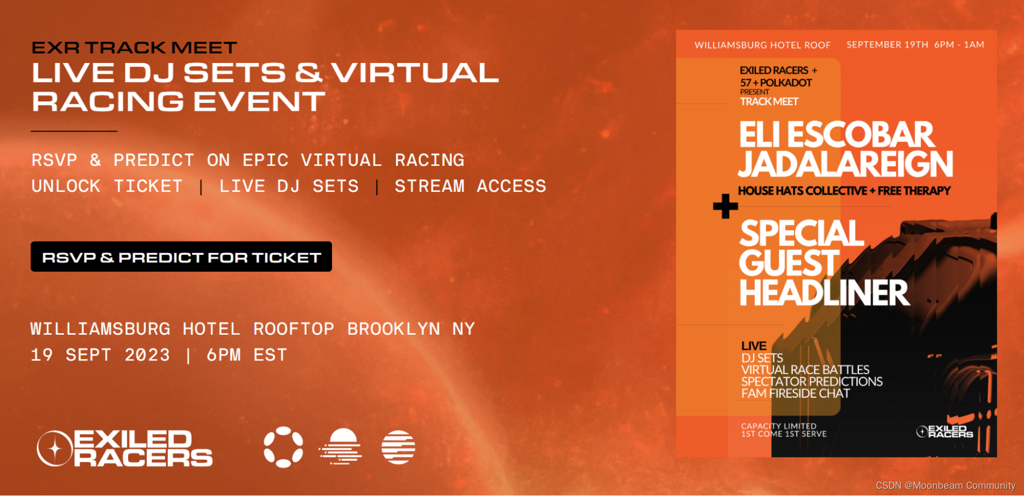 另外,Moonbeam上的顶尖游戏项目Exiled Racers将会提前一日,9月19日晚上6点开始在Williamsburg Hotel Rooftop恭候大家前来交流碰杯!在纽约的小伙伴们不要错过!如果正巧不在也没关系,线上也能参与竞猜!RSVP at https://trackmeet.exiledracers.com/
