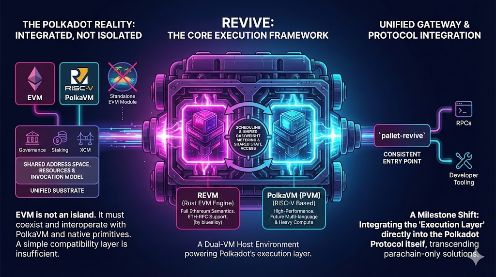 过去,Polkadot 在共识与安全层实现了高度统一,但在执行层却长期呈现出碎片化状态:不同平行链各自实现执行逻辑,EVM 只是“被托管”的一类合约环境,而非协议级的系统能力。