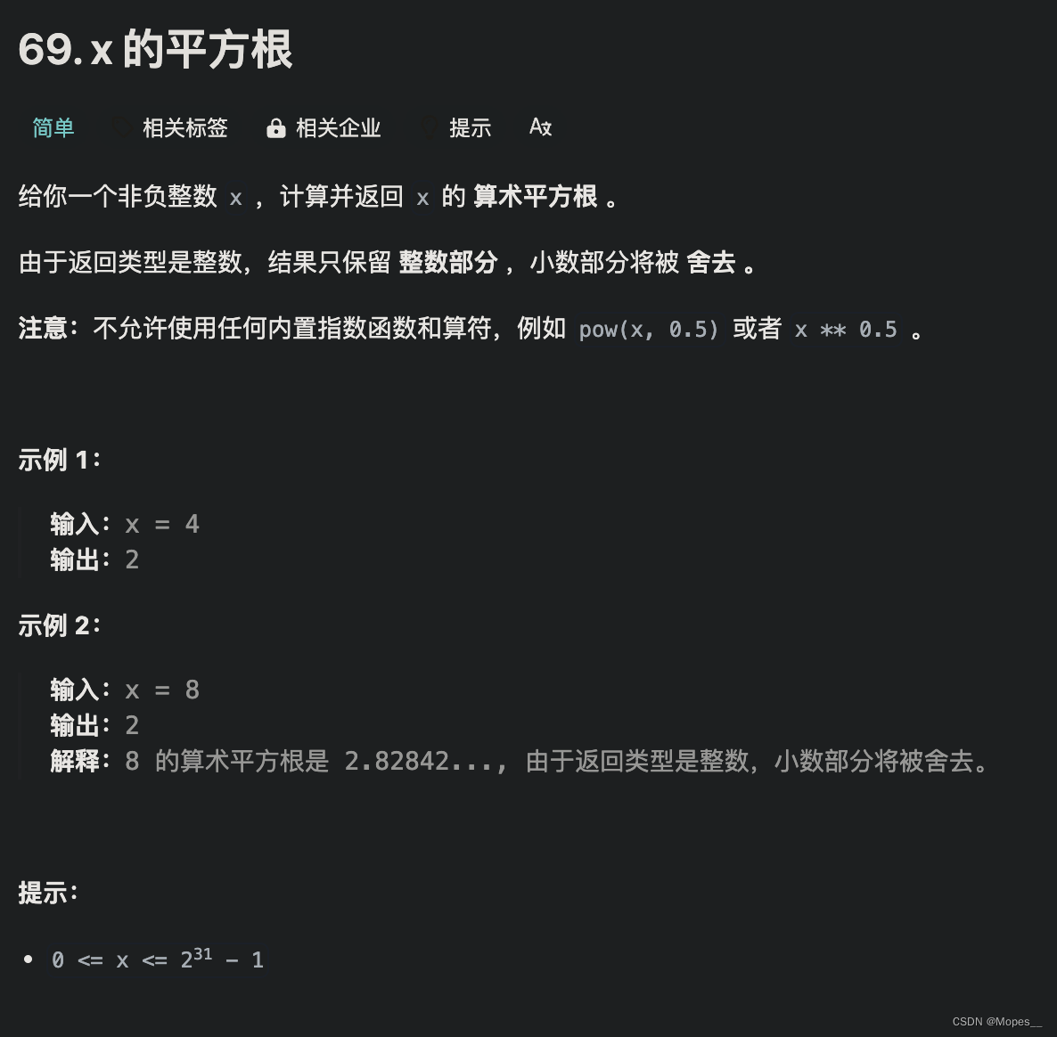 本文介绍了一个名为`mySqrt`的函数,用于计算给定整数x的平方根,采用二分搜索方法并考虑浮点数精度。通过循环迭代逼近,当两者差值小于1e-7时停止,返回近似整数结果。