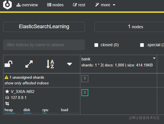 我们可以通过Cerebro查看相应的集群状态和节点分片信息: