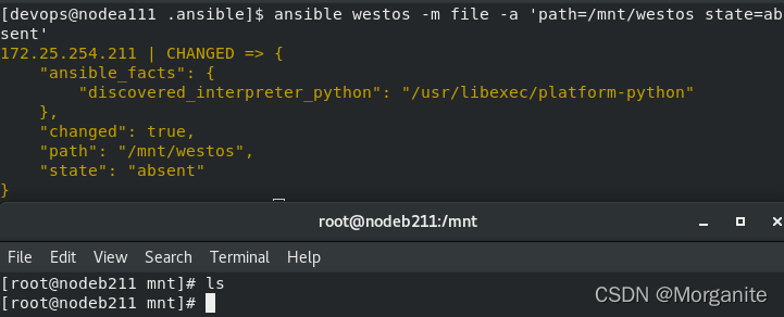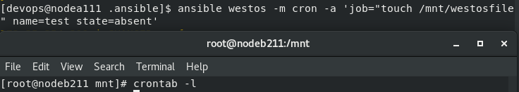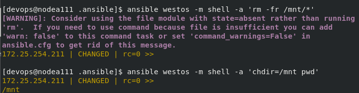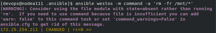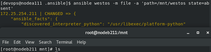 [devops@nodea111 .ansible]$ ansible westos -m file -a 'path=/mnt/westos state=absent'