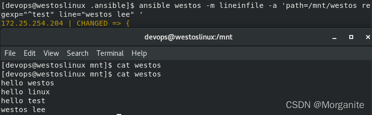 [devops@nodea111 .ansible]$ ansible westos -m lineinfile -a 'path=/mnt/westos regexp="^test" line="westos lee" '