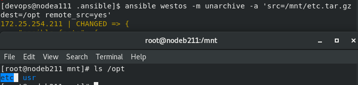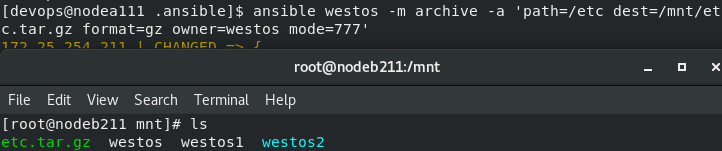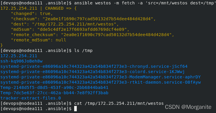 [devops@nodea111 .ansible]$ ansible westos -m fetch -a 'src=/mnt/westos dest=/tmp'