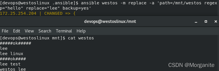 [devops@nodea111 .ansible]$ ansible westos -m replace -a 'path=/mnt/westos regexp="hello" replace="lee" backup=yes'