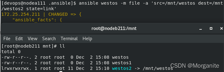 [devops@nodea111 .ansible]$ ansible westos -m file -a 'src=/mnt/westos dest=/mnt/westos2 state=link'