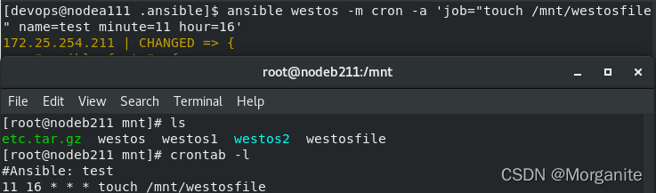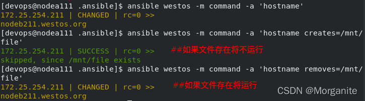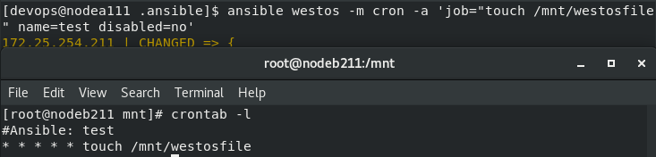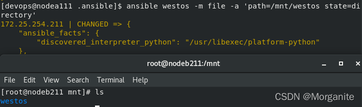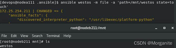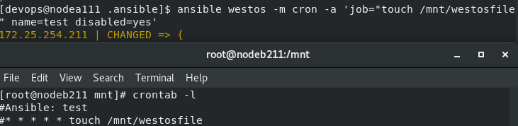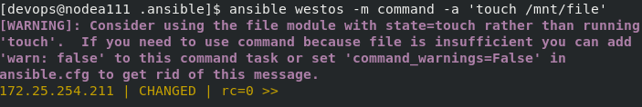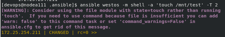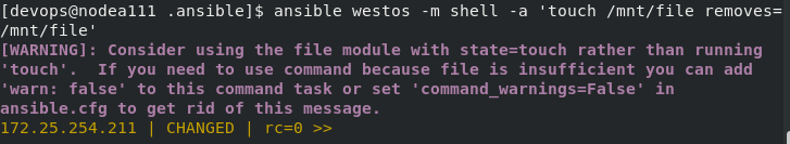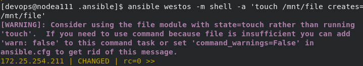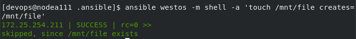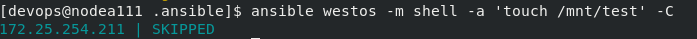 [devops@nodea111 .ansible]$ ansible westos -m file -a 'path=/mnt/westos state=touch'