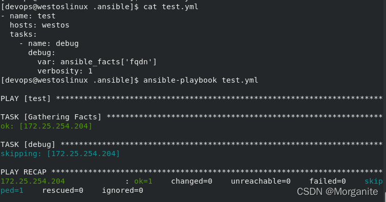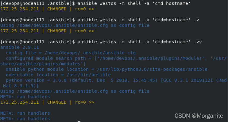 [devops@nodea111 .ansible]$ ansible westos -m debug -a 'var=hello' ##不可以直接写