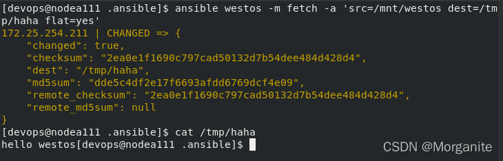 [devops@nodea111 .ansible]$ ansible westos -m fetch -a 'src=/mnt/westos dest=/tmp/haha flat=yes' ##复制到指定目录下