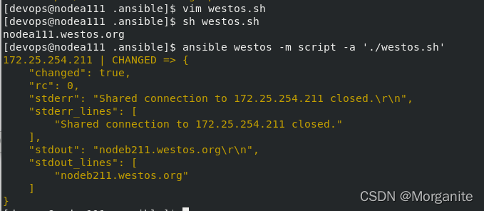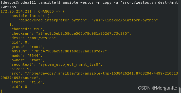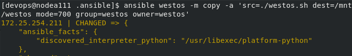 [devops@nodea111 .ansible]$ ansible westos -m copy -a 'src=./westos.sh dest=/mnt/westos mode=700 group=westos owner=westos' ##更改权限、所有组、所有人