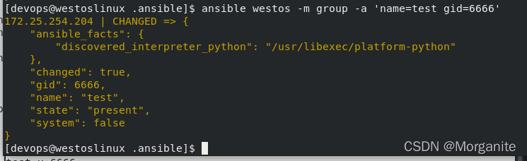 [devops@nodea111 .ansible]$ ansible westos -m group -a 'name=test gid=6666'