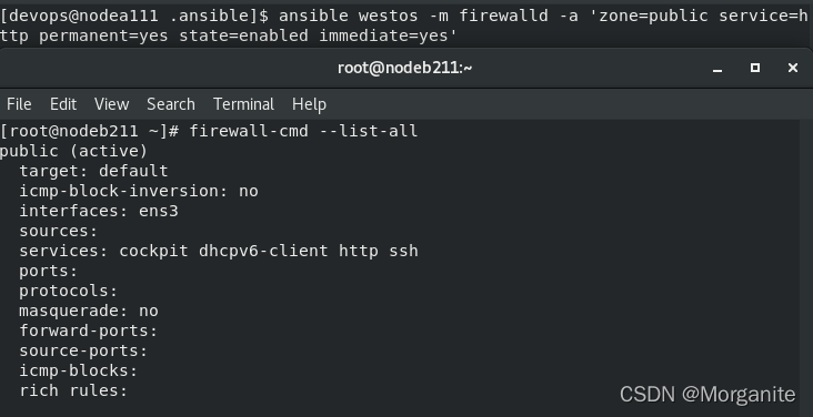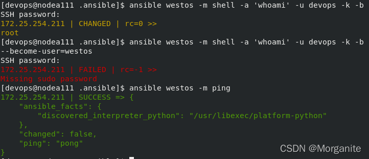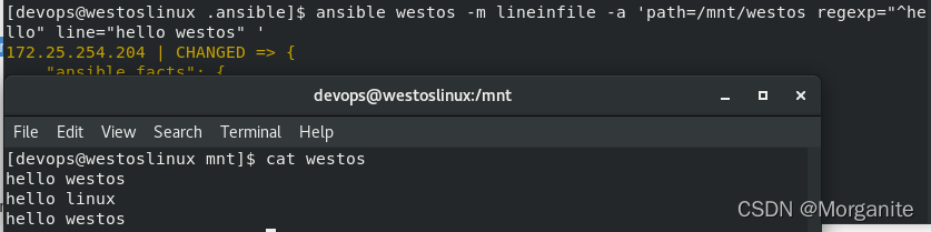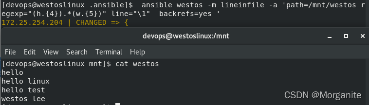 [devops@nodea111 .ansible]$ ansible westos -m lineinfile -a 'path=/mnt/westos regexp="(h.{4}).*(w.{5})" line="\1" backrefs=yes '##找出 hello westos替换为hello