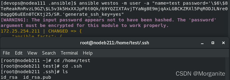 [devops@nodea111 .ansible]$ ansible westos -m user -a "name=test password='\$6\$GOcfEzuS1DCcDurG$doGWB7VhHsTyr10qdQkwwspt/YROi9Pwkb37Yx4GcyKxEnfvio3w0//5uDzZLxOfrgPdkjzEsJmcb8TmWamFa.' generate_ssh_key=yes"