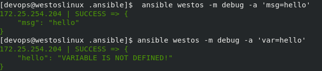 [devops@nodea111 .ansible]$ ansible westos -m debug -a 'msg=hello'