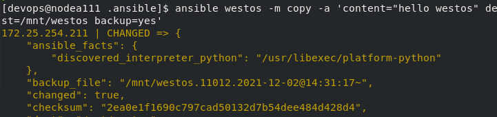 [devops@nodea111 .ansible]$ ansible westos -m copy -a 'content="hello westos" dest=/mnt/westos backup=yes' ##指定文本内容并备份原文件