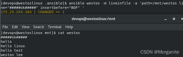 [devops@nodea111 .ansible]$ ansible westos -m lineinfile -a 'path=/mnt/westos line="#####ok#####" insertbefore="BOF" '