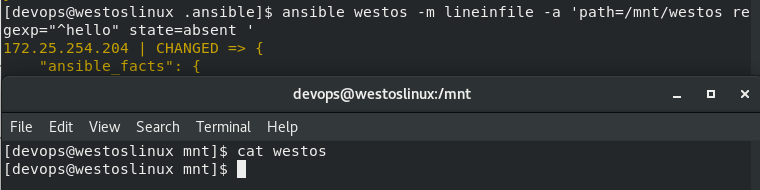 [devops@nodea111 .ansible]$ ansible westos -m lineinfile -a 'path=/mnt/westos regexp="^hello" state=absent '