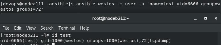 [devops@nodea111 .ansible]$ ansible westos -m user -a 'name=test uid=6666'
