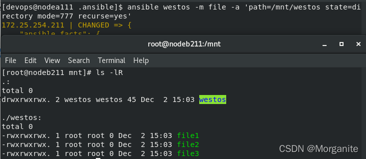 [devops@nodea111 .ansible]$ ansible westos -m file -a 'path=/mnt/westos state=directory mode=777 recurse=yes'