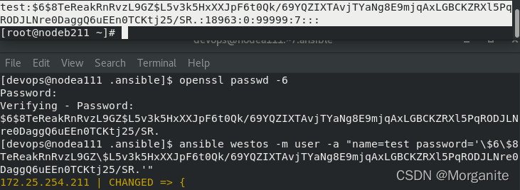 [devops@nodea111 .ansible]$ ansible westos -m user -a "name=test password='\$6\$GOcfEzuS1DCcDurG$doGWB7VhHsTyr10qdQkwwspt/YROi9Pwkb37Yx4GcyKxEnfvio3w0//5uDzZLxOfrgPdkjzEsJmcb8TmWamFa.'"