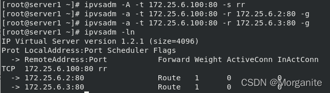 [root@server1 ~]# ipvsadm -a -t 172.25.6.100:80 -r 172.25.6.3:80 -g