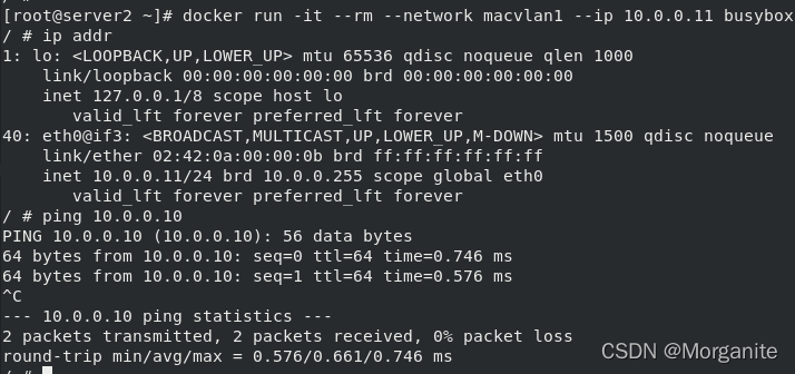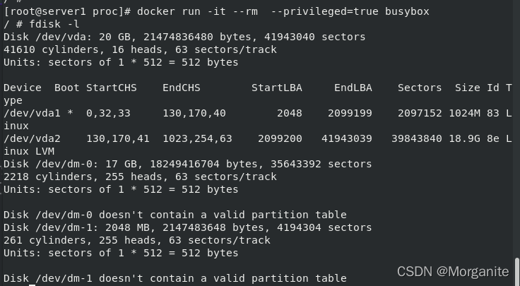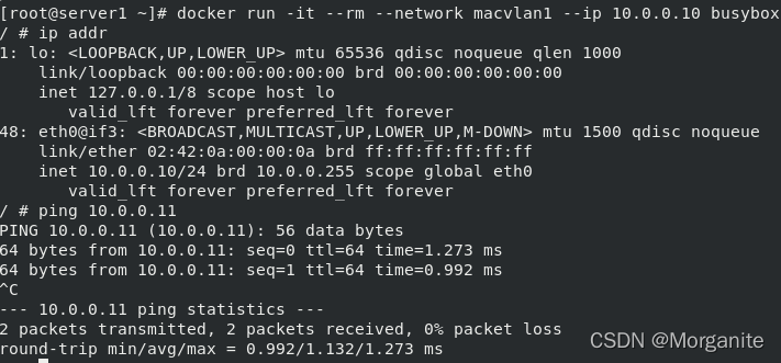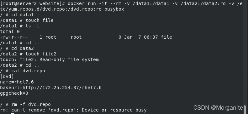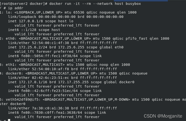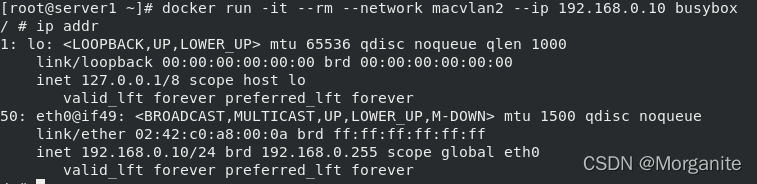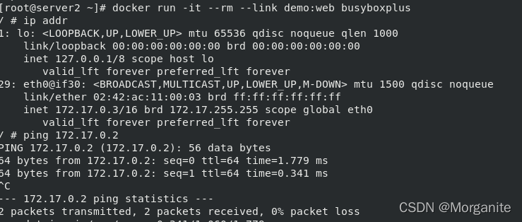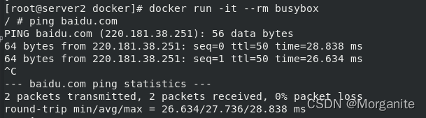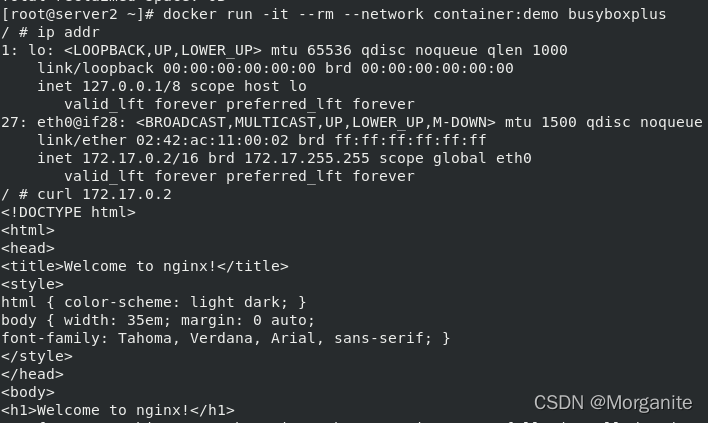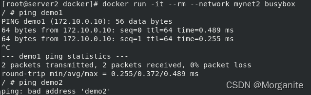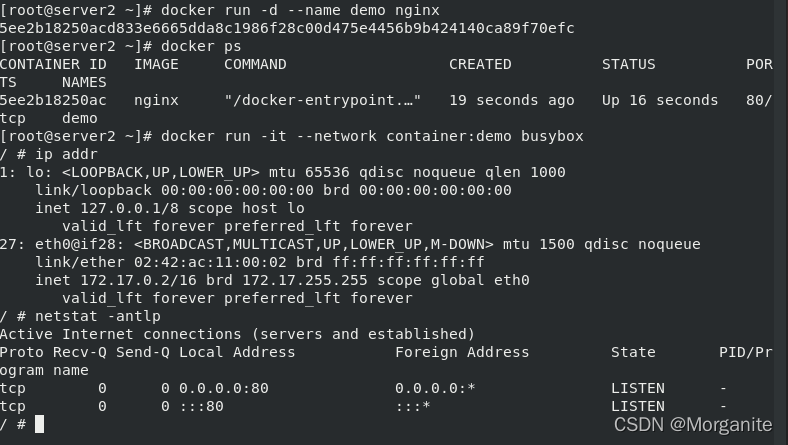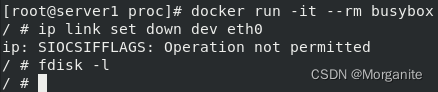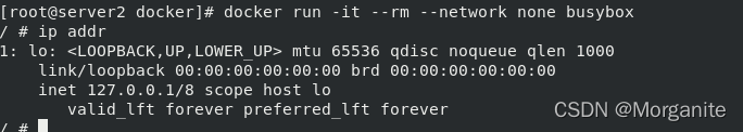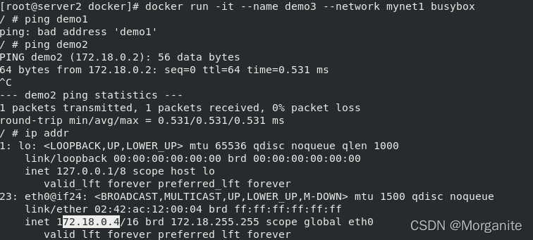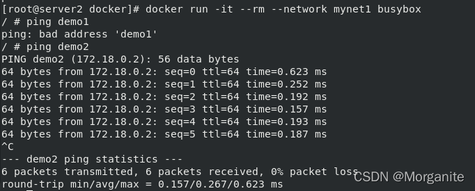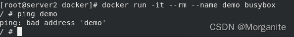 [root@server1 ~]# docker run -it --name demo busybox 这里输入命令,ctrl d退出