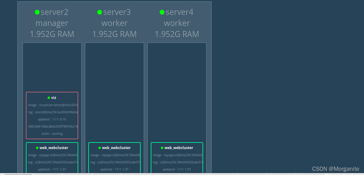 node.role == manager指定这个service的实例均运行在swarm manager节点上,不会分到worker节点