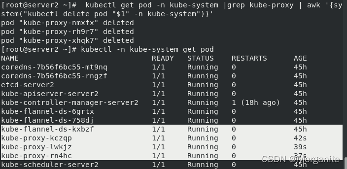 [root@server2 ~]# kubectl get pod -n kube-system |grep kube-proxy | awk '{system("kubectl delete pod "$1" -n kube-system")}'